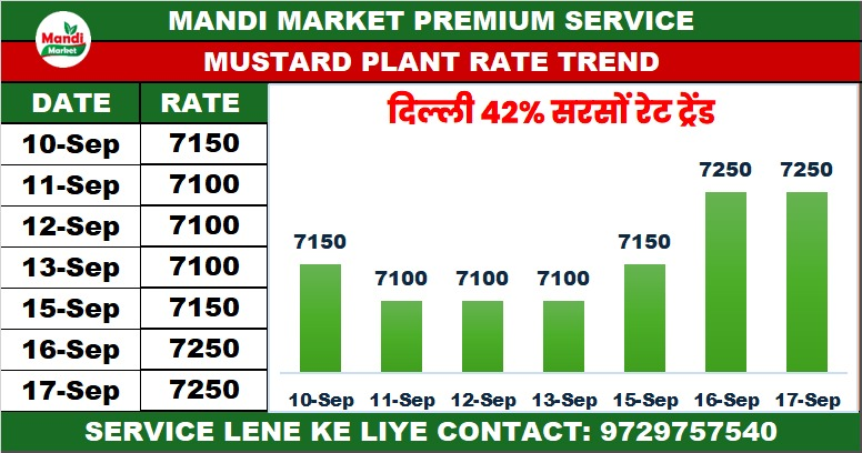 सरसों 42% कंडीशन भाव ₹ 7250 स्थिर