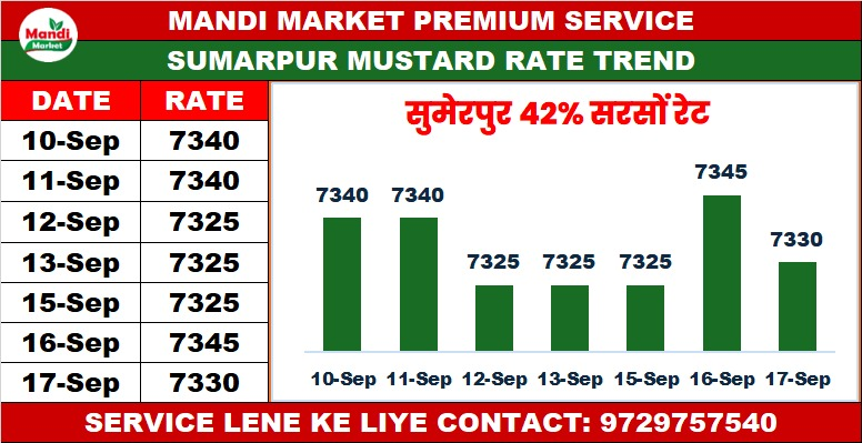 सरसों 42% कंडीशन भाव ₹ 7310/7330 मंदी 15
