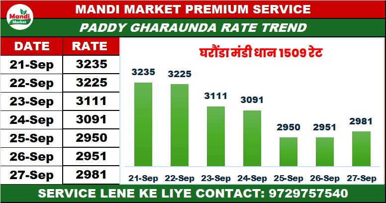 धान 1509 हाथ भाव ₹ 2800 से ₹ 2961 मंदी 21