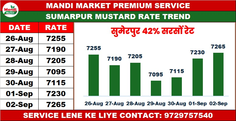 सरसों 42% कंडीशन भाव ₹ 7240 से ₹ 7265 तेजी 35