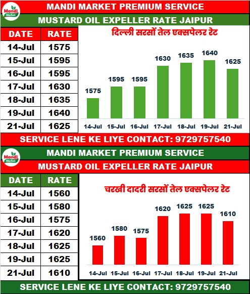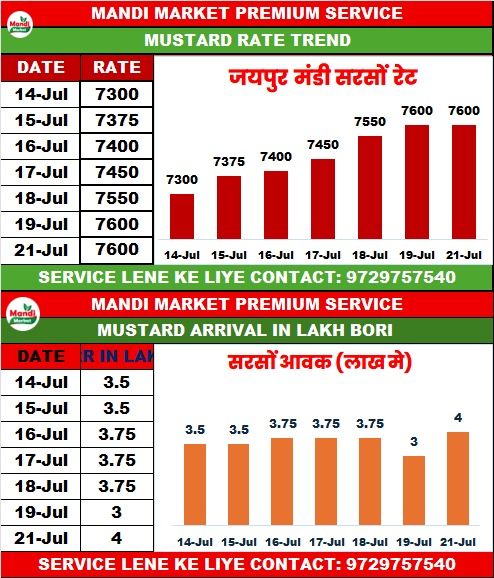 जयपुर में सरसों बिकी 7600 तक | सलोनी पर 100 रुपये टूटे रेट | देखें सरसों के ताजा रेट तेजी मंदी के साथ | 21 जुलाई 2025