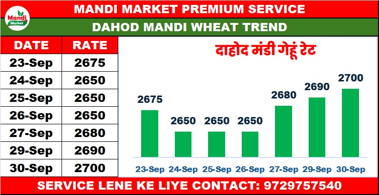 गेहूं 1.50% CD भाव ₹ 2650 से ₹ 2650 स्थिर