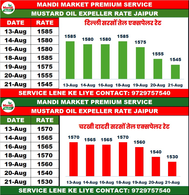 सरसों तेल एक्सपेलर भाव ₹ 1560/1550 मंदी ₹ 20