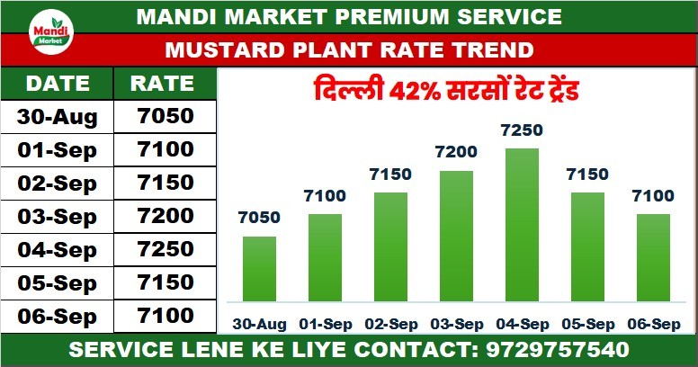 सरसों 42% कंडीशन भाव ₹ 7100 मंदी ₹ 50