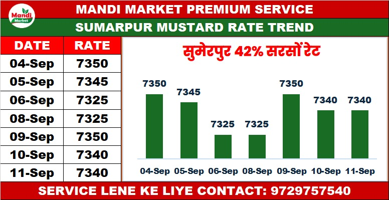 सरसों 42% कंडीशन भाव ₹ 7310/7340 तेजी 0