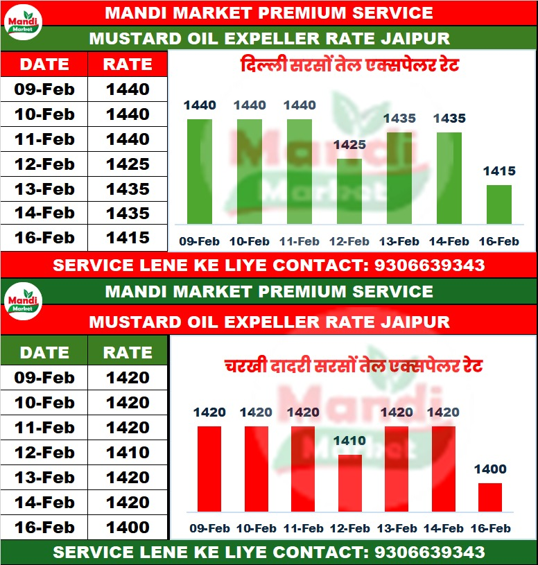 सरसों तेल एक्सपेलर भाव ₹ 1415 मंदी ₹ 20