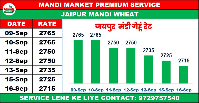 गेहूं राजस्थान नेट मिल डिलीवरी भाव ₹ 2730 मंदी ₹ 10