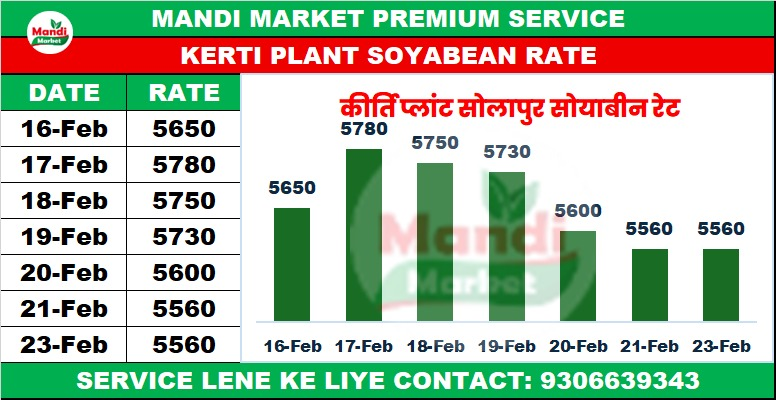 मासिक रुझान में भी साफ दिखा कि 6150 की ऊंचाई छूने के बाद बाजार टिक नहीं पाया। 5500 का सपोर्ट मजबूत माना गया था, वहां से 150 रुपये की रिकवरी भी आई, लेकिन वह लंबी नहीं चली। अब हालात यह हैं कि कीर्ति प्लांट 5560-5540 की पट्टी में घूम रहा है। 21 फरवरी के भाव देखें तो सोलापुर 5560 (-40), लातूर 5540 (-40), कुश्श्रूर 5540 (-40) और हिंगोली 5560 (-40) पर रहे। यानी बाजार अभी 5500 के आसपास सांस ले रहा है। महाराष्ट्र मंडियों में अमरावती 5150, बार्शी 5150 (-150), वाशिम 5100 और खामगांव 5100 (-150) रहे। मध्य प्रदेश में उज्जैन 5100 (-100), इंदौर 5400, करेली 5028 (-222) और अशोकनगर 5250 रहे। साफ है कि मंडी साइड भी उत्साह में नहीं है।
