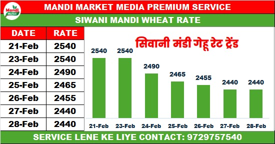 गेहूं राजस्थान मिल क्वालिटी नेट (WHEAT RAJASTHAN MILL QUALITY NET) भाव ₹2525 ↓ मंदी ₹65