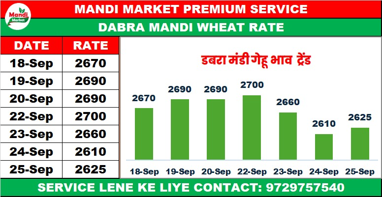 गेहूं बढ़िया राज भाव ₹ 2625 तेजी ₹ 15