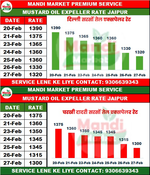 सरसों तेल एक्सपेलर (MUSTARD OIL EXP.) भाव ₹1300 ↓ मंदी ₹20
