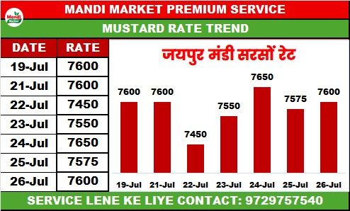 जयपुर में सरसों के भाव सोमवार को 7600 के स्तर पर खुलकर शनिवार को इसी स्तर पर बंद हुए। बात भरतपुर की करें यहां पर सरसों में गिरावट हुई और सरसों के भाव 7100 से कमजोर होकर 7025 पर बंद हुए। हफ्ते के भरतपुर में सरसों तेल कच्ची घानी के रेट 1685 से गिरकर 1640 रुपये प्रति 10 किलो के रह गए और जयपुर में भी लगभग 30 रुपए की गिरावट देखने को मिली। हालांकि सरसों खल के भाव में कोई बड़ी गिरावट नहीं हुई और भाव ₹10-20 रुपये की तेजी मंदी में रहे। हाजिर मंडियों में भी सरसों के भाव लगभग 100 रुपए तक लुढ़के हैं। पूरे हफ्ते (21-26 जुलाई) के दौरान सरसों की औसत आवक 3.5 लाख बोरी की रही है।